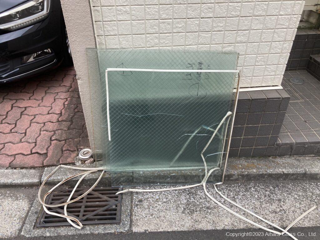 ガラスは掃き出し窓の下側の「型のヒシワイヤー」が左右分で割れていました。ヒビの入り方から恐らく熱割れでしょう。