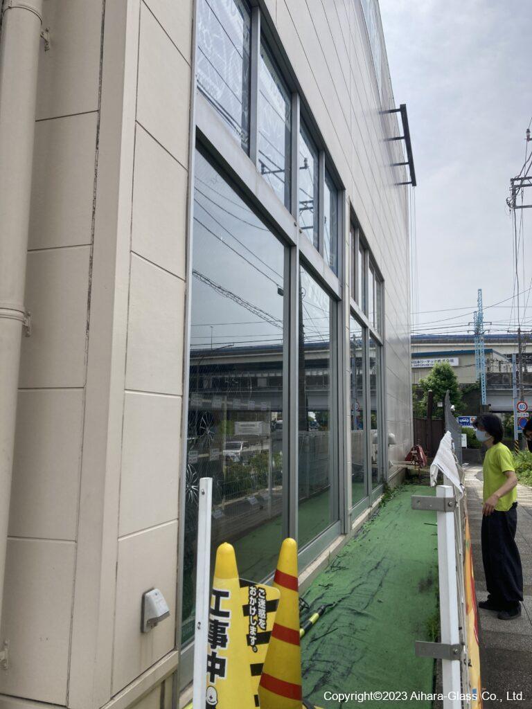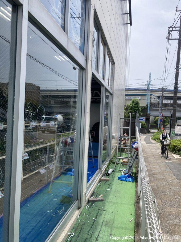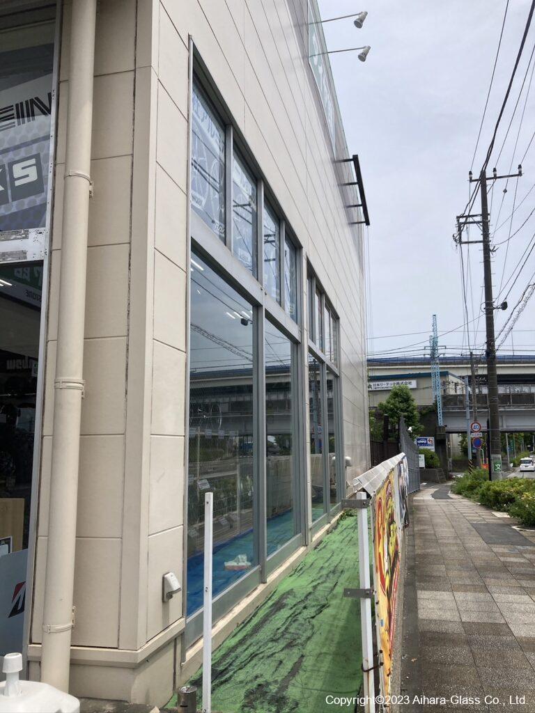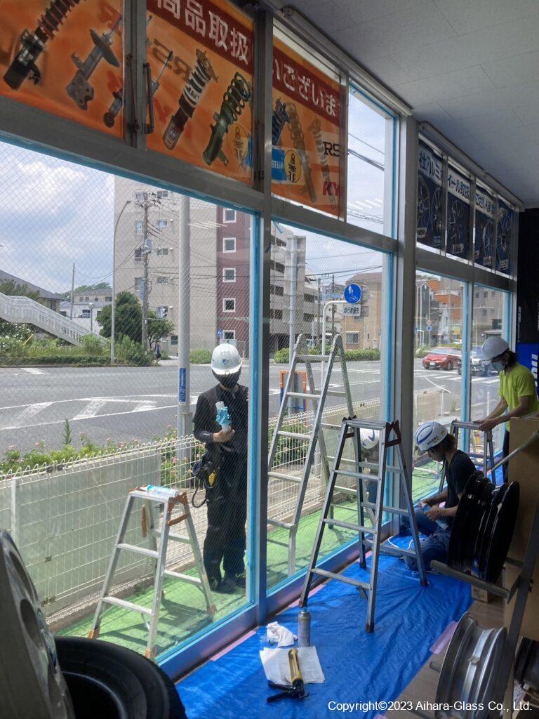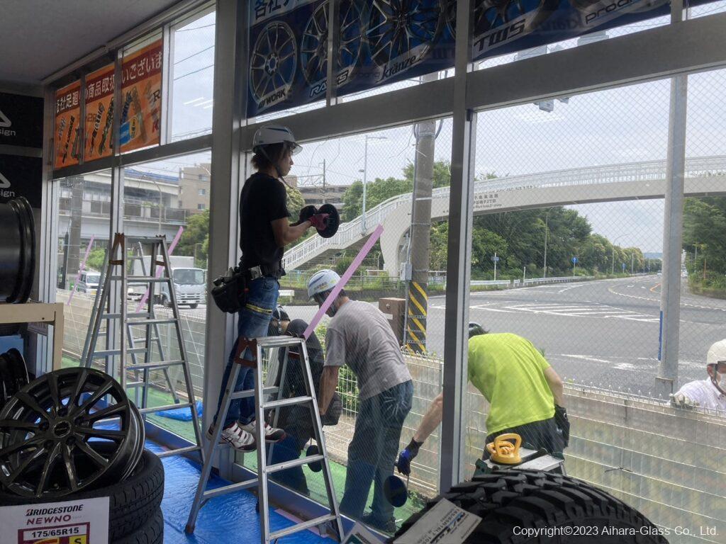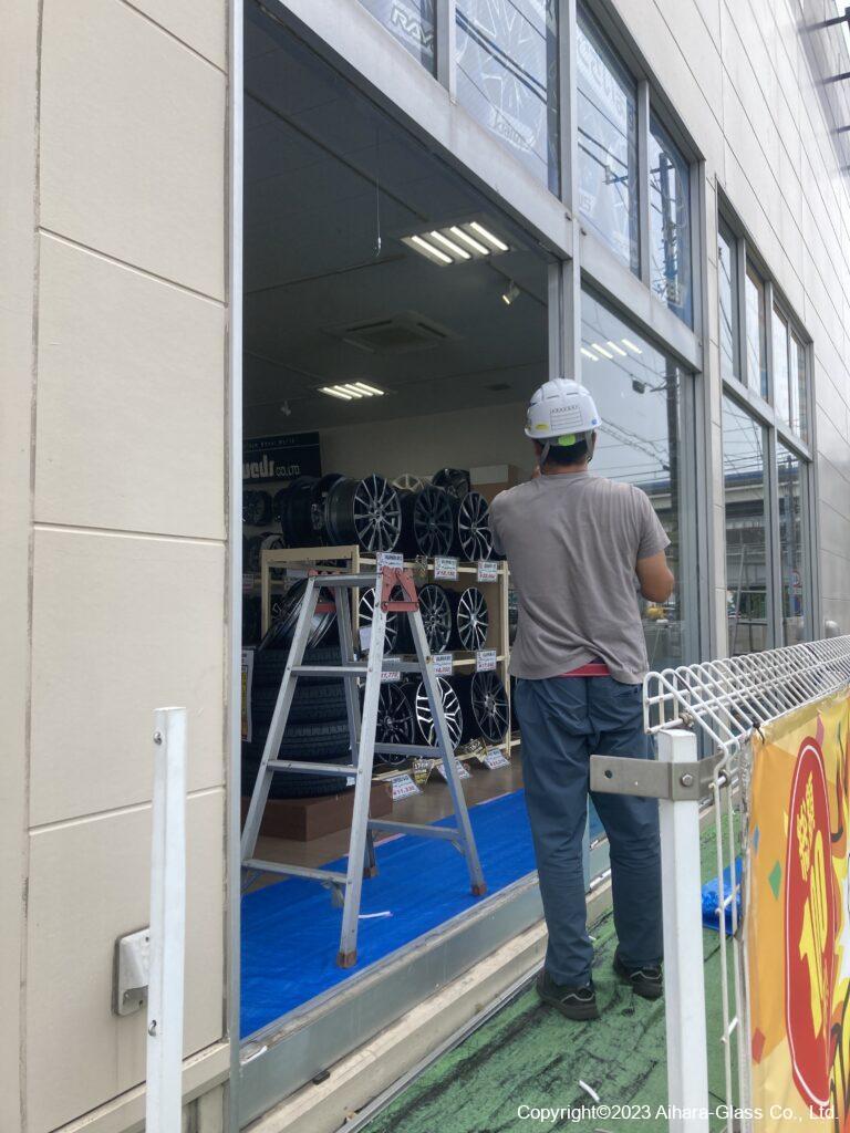 タイヤ屋さんの大型ショーウィンドウのガラス交換をしました。