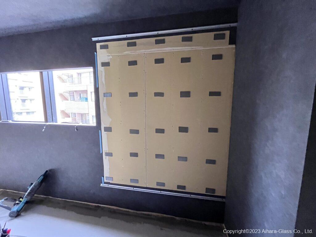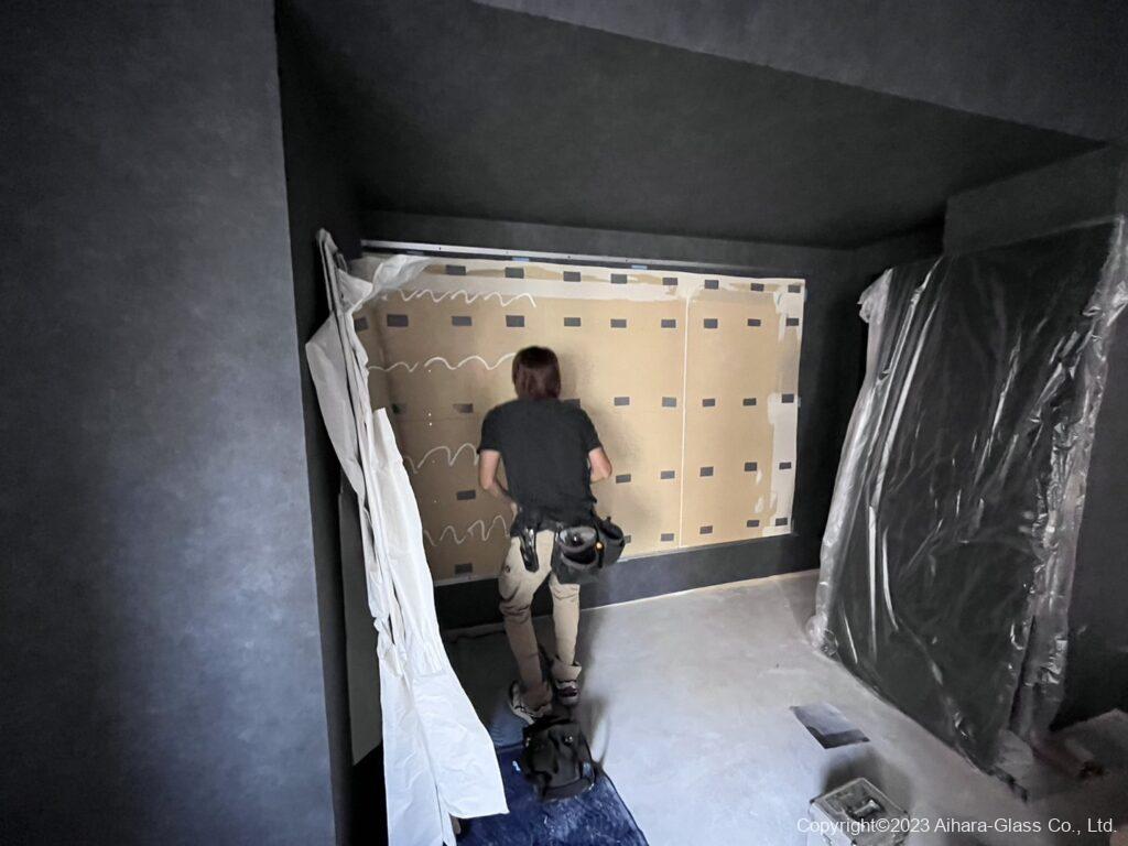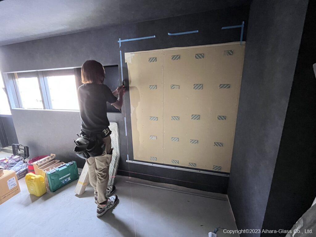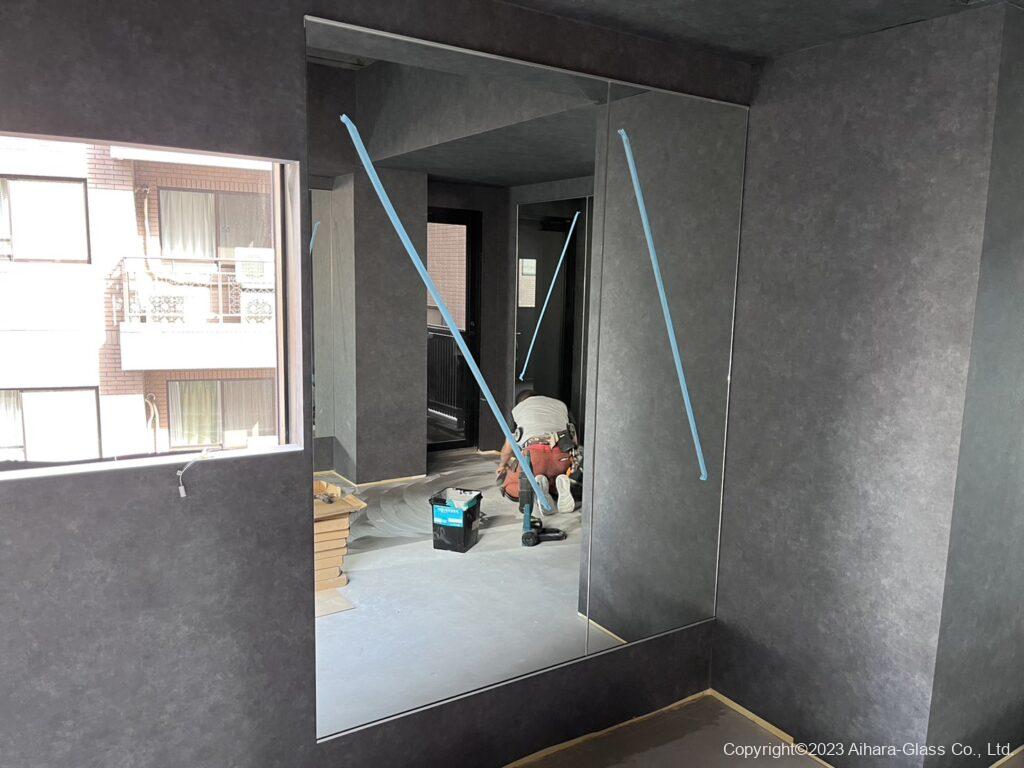 鏡と鏡の間、鏡と壁との間、本当は隙間なくピシっと行きたいのですが、地震が起きた際に鏡同士や壁と鏡が軽く干渉すると、鏡が割れる事が多いので、その旨をお伝えした上で隙間は3ミリ程取ると言う事で進めさせて頂きました。