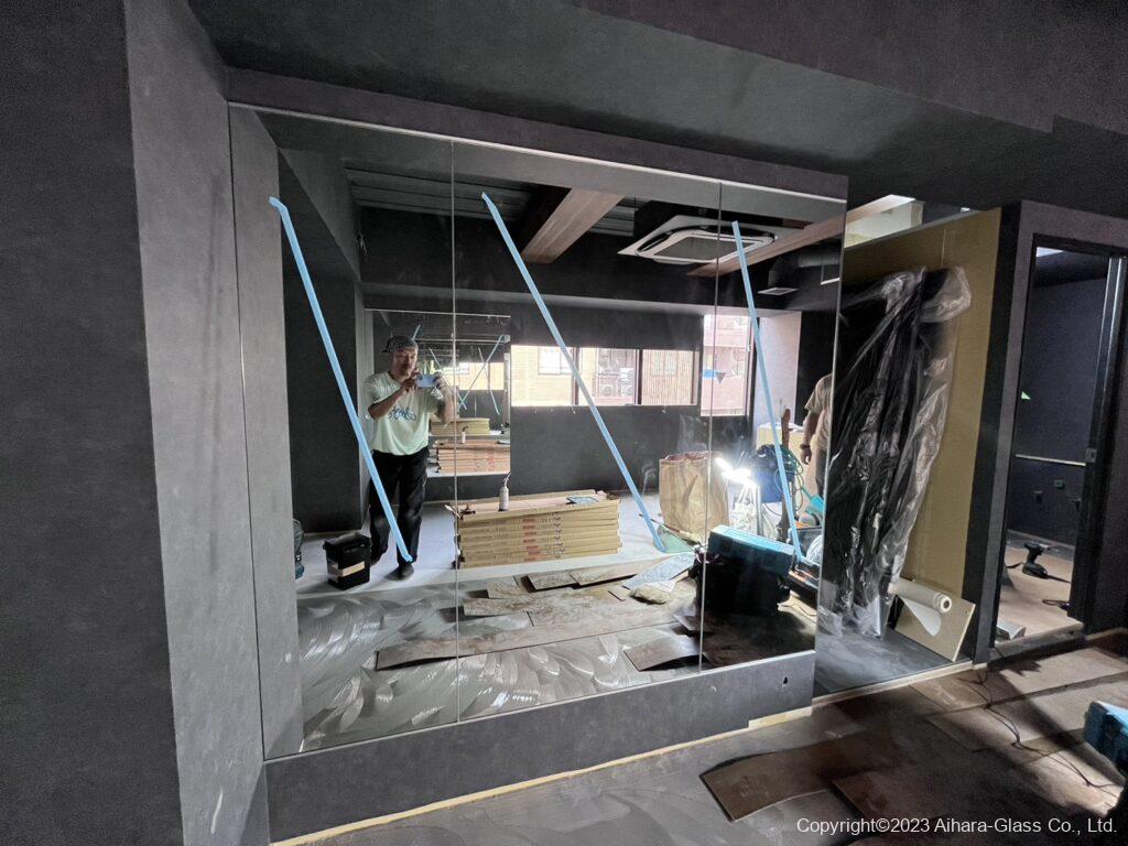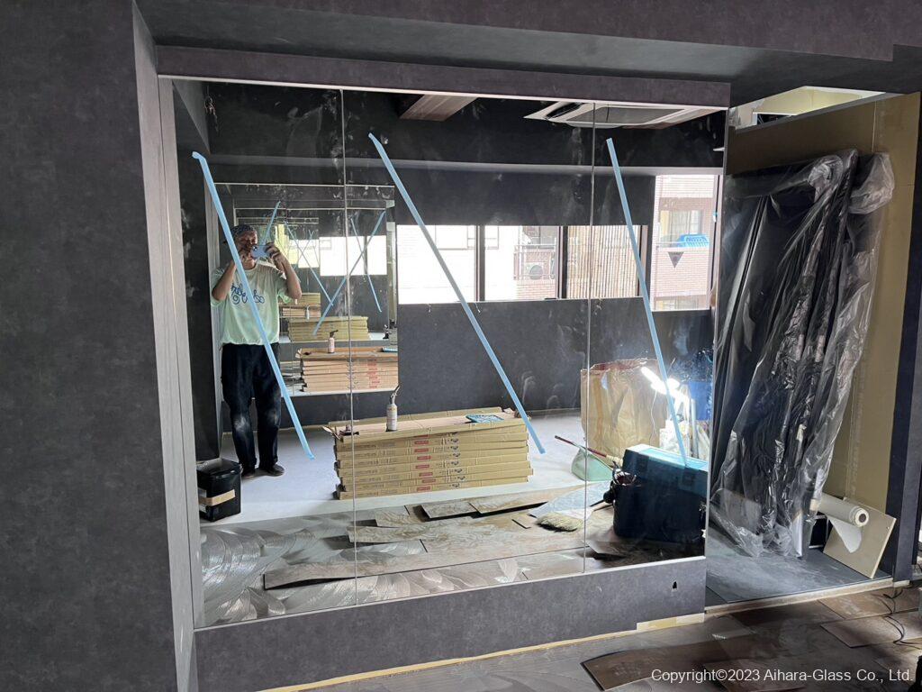 今回は建物の5階でエレベーターのサイズもあるので分割して搬入出来るサイズで鏡を設置させて頂きました。