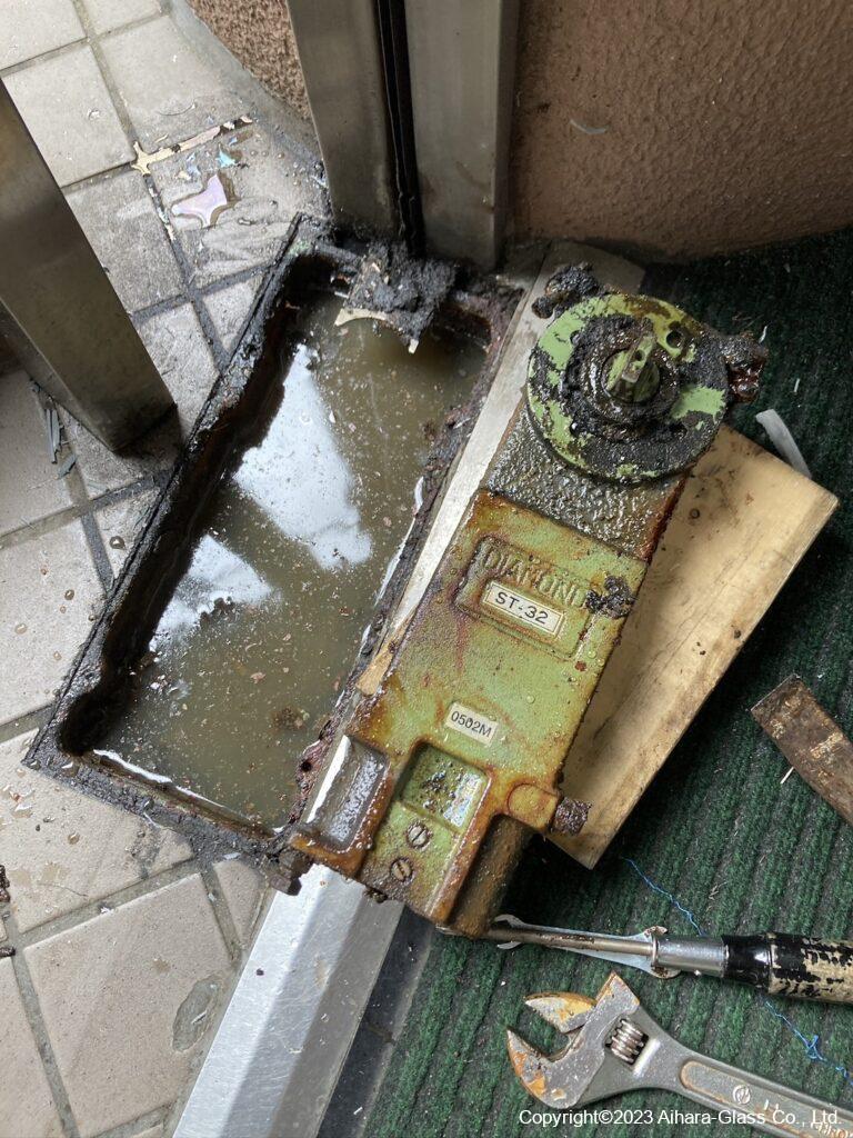 先日近所にあるマンションのエントランスのガラスが割れてしまったとの事で現調して来たのですが、原因がフロアヒンジの油圧が壊れてしまった事で、扉の開閉スピードが速くなってしまい「バァーーン」と閉まった勢いでガラスが割れてしまった様です。