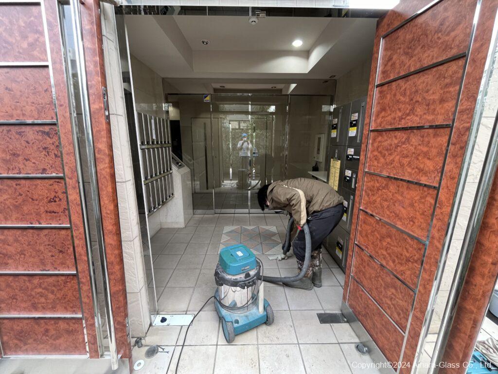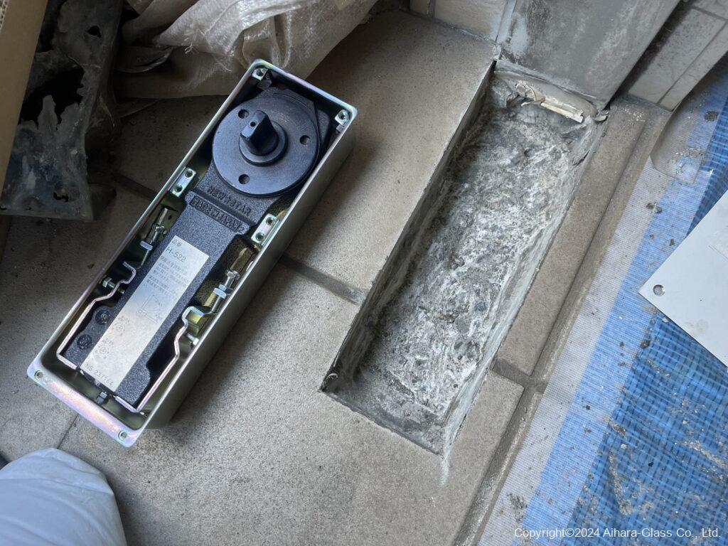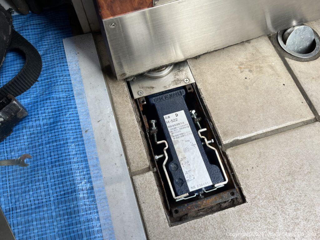 その事を管理会社様にご報告すると「この際なので同じタイミングで2台共に交換して欲しい」との事で、今回は両開きのエントランス扉のフロアヒンジを2台交換させて頂きました。