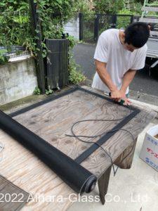 下目から撮影してしまったので上が狭く見えますが(笑、下の枠が干渉しない様に上下にクリアランスを設けて取り付けいたしました。写真を見ていただくとわかるのですが、上下均等にしてしまうと枠の下側が腐食していてまた持ち上がってくる可能性があるので少し上目に取り付けてあります。
