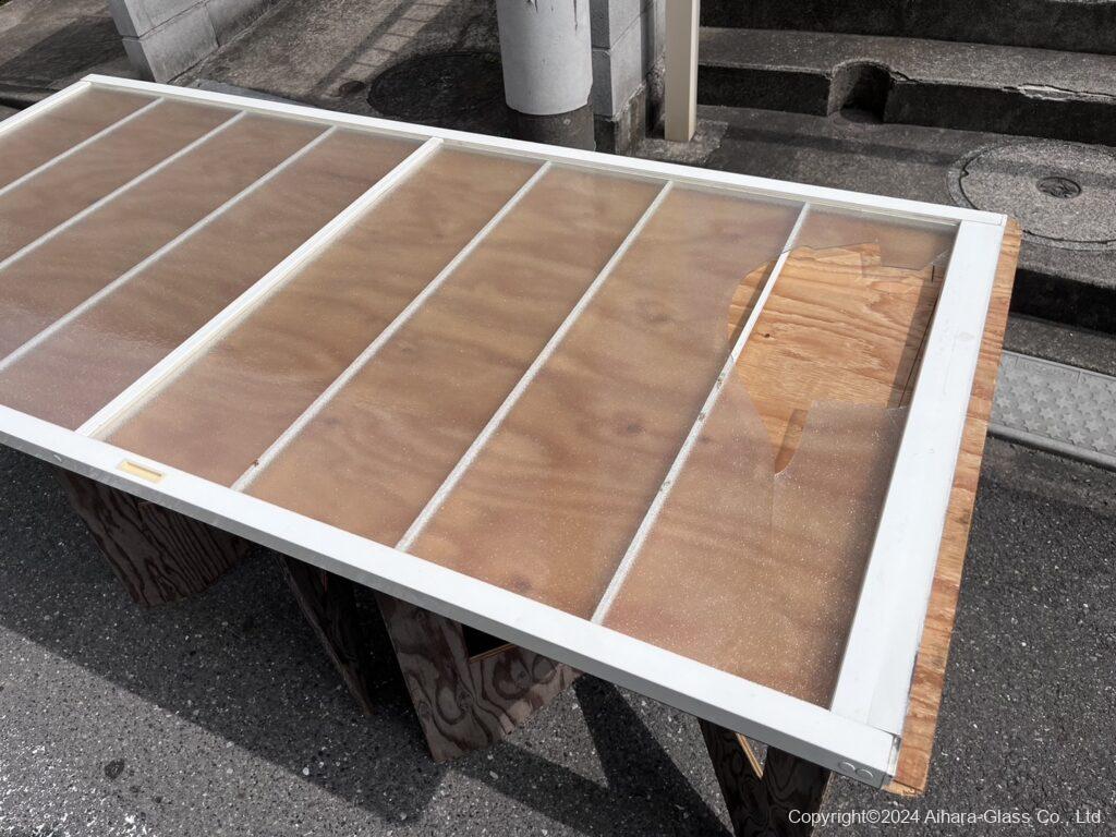 この2mmのガラスは何気に割れやすいし、網入りではない故割れたらドスンと落ちるので、個人的にはもうアクリル製の物に変えた方が良いなぁと思うのですが、保険等の兼ね合いもあるのか?意外と「ガラスの方で!」とご依頼を頂きます。