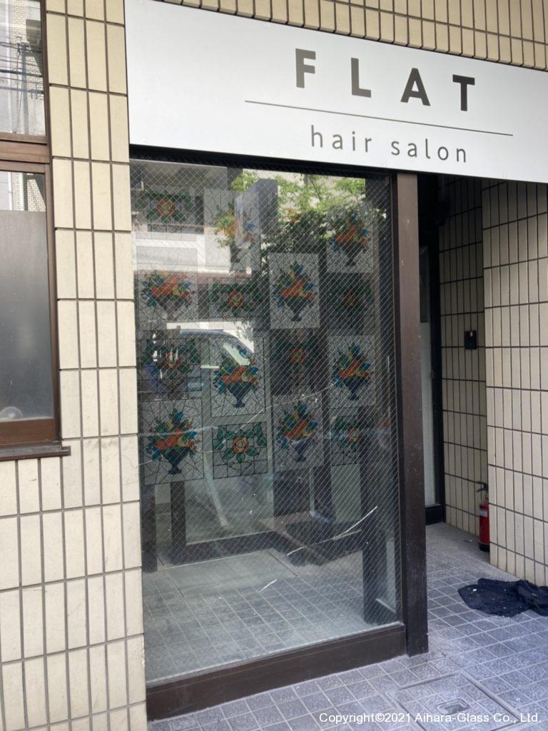 後よくあるのですが、ガラスにこの様にフィルムを貼られる方がいらっしゃるのですが、日当たりの良い場所ですと網入りは熱割れの可能性をフィルムが高める事がございますので、ご自身での施工の場合は十分ご注意ください。