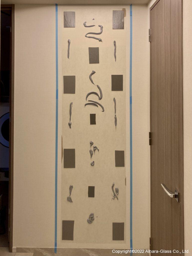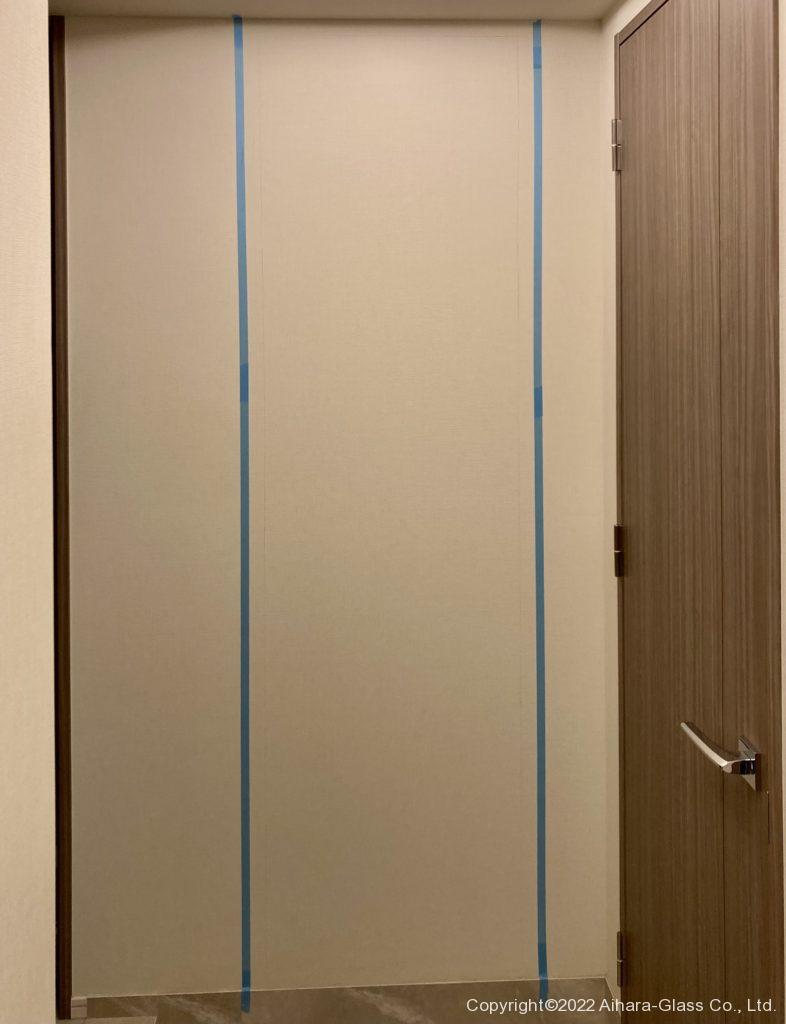 まずはクロスに鏡のサイズと取り付けの位置を紙テープで出し、お客様にご確認頂きます。