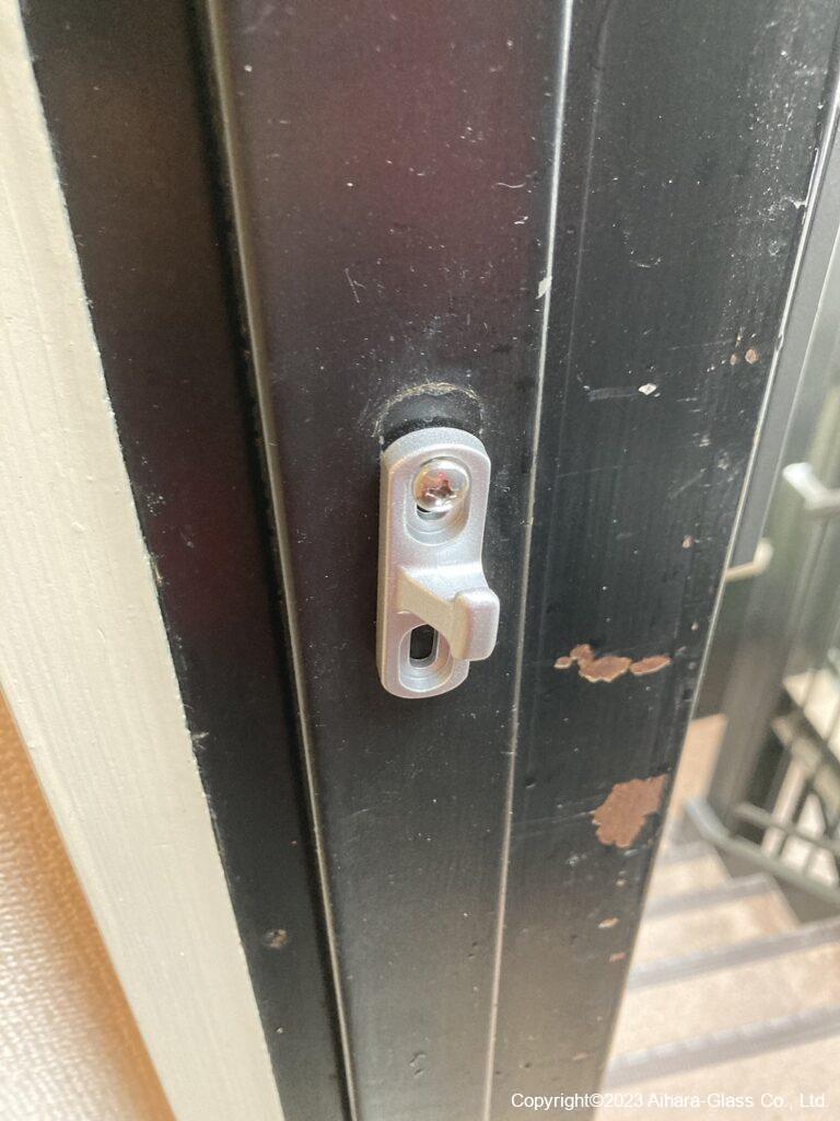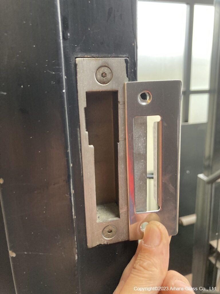玄関ドアのラッチの受けが枠に付いているのですが、既存の物と新しい物ですとビスピッチ(ビス間の幅)が新しい物の方が小さく、ビスが留められない状態でしたので今回は既存の物をそのまま使用する事にしました。