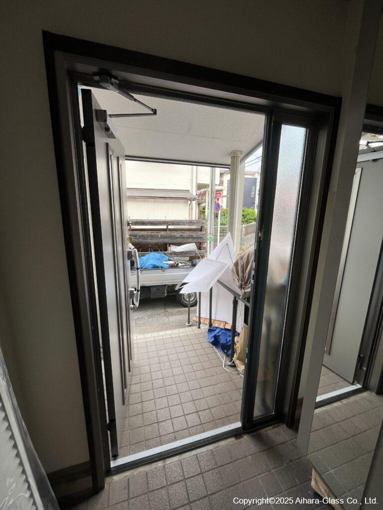 玄関枠自体がスチール製の物でしたので、方立をカットしてから新設の枠を設置致しました。