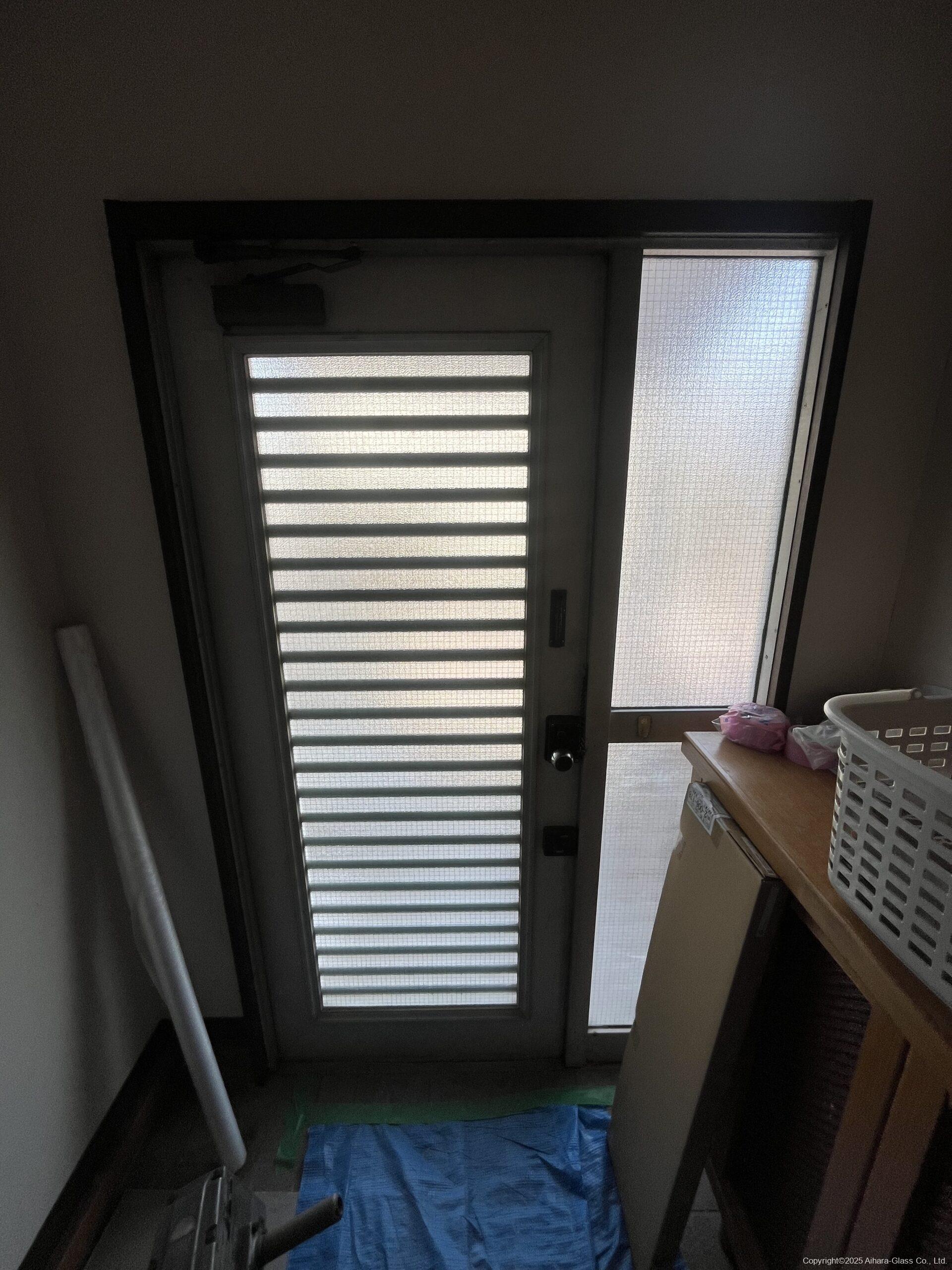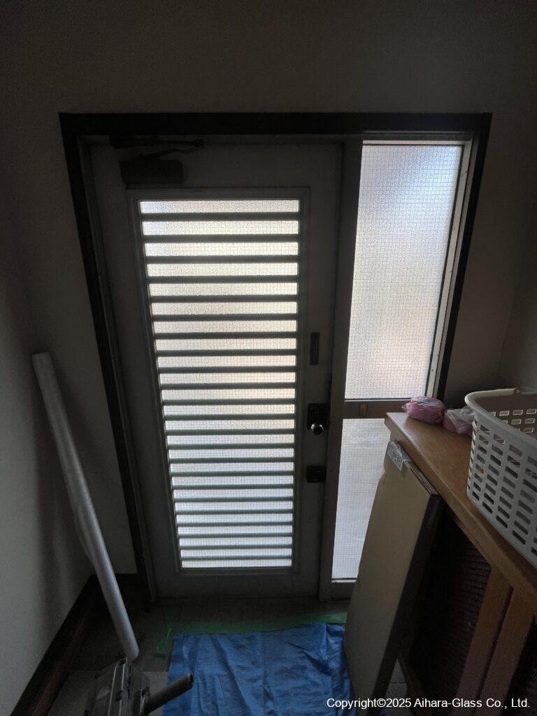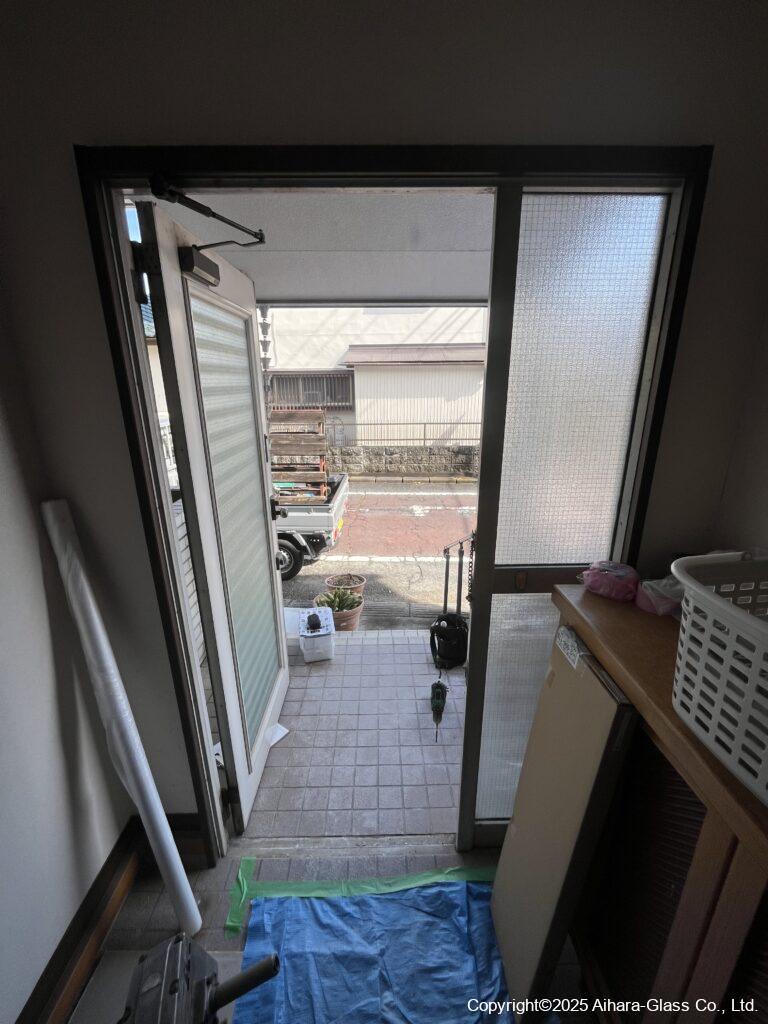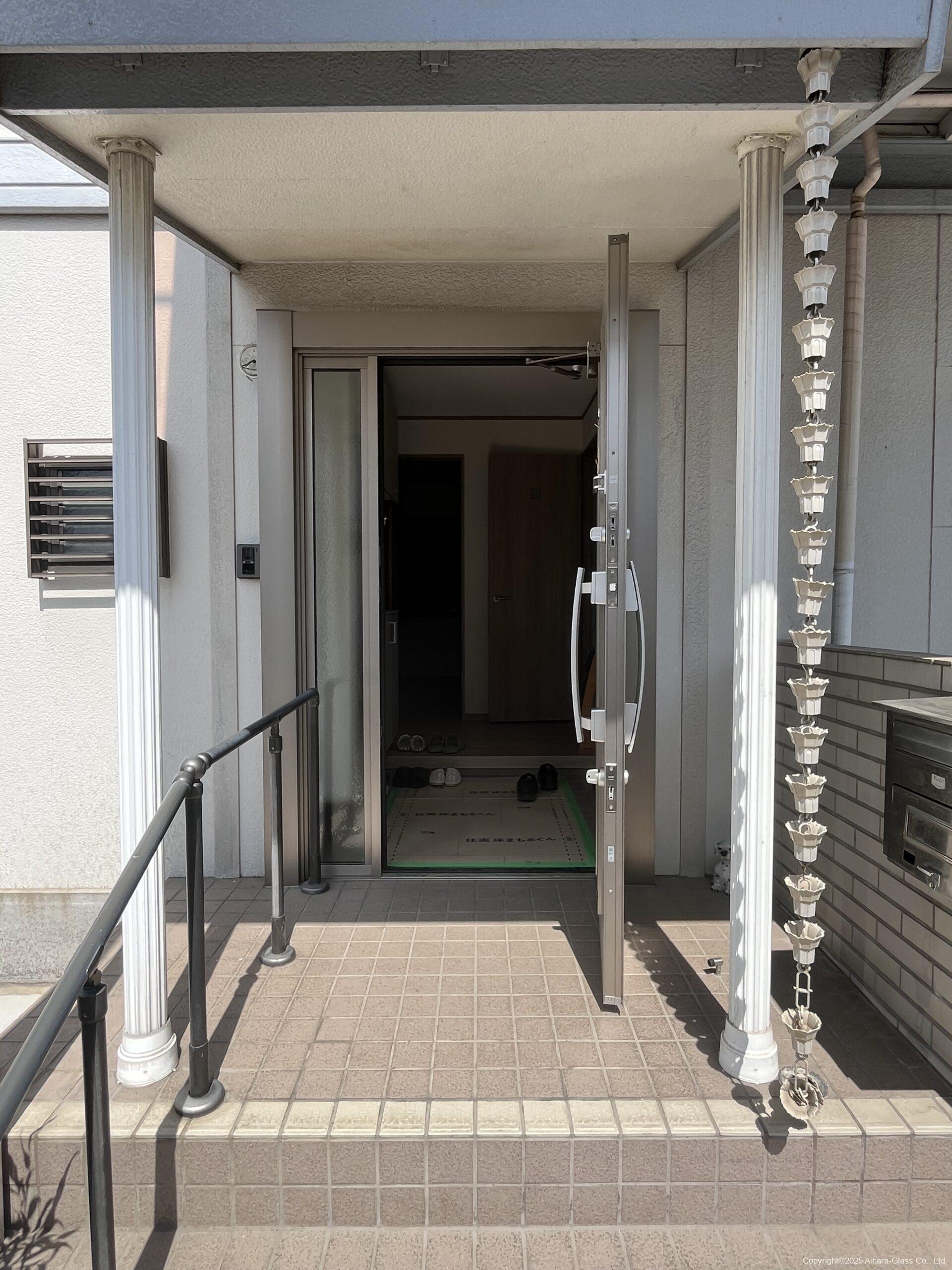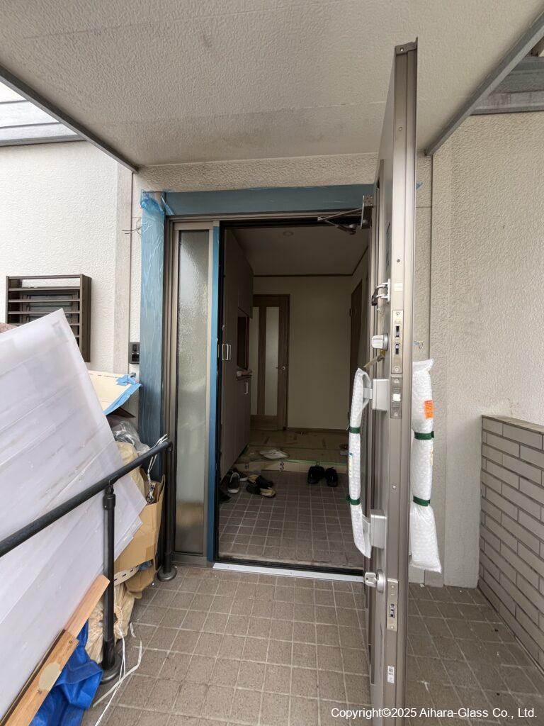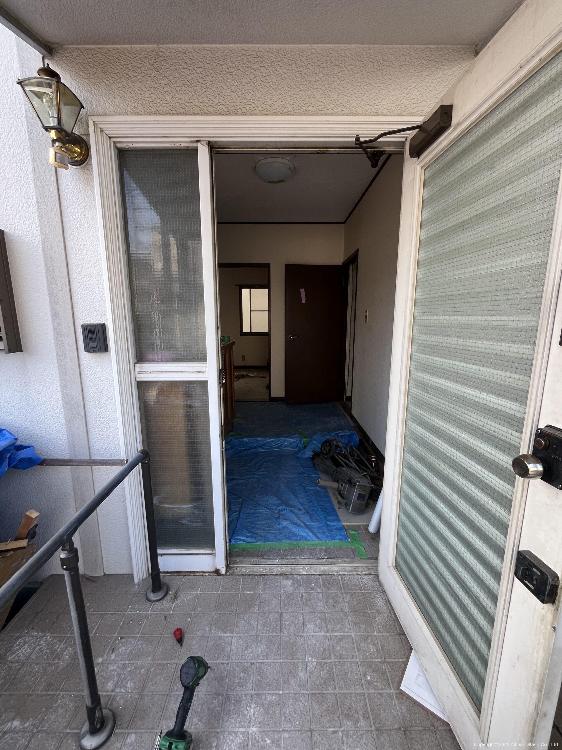 玄関枠自体がスチール製の物でしたので、方立をカットしてから新設の枠を設置致しました。