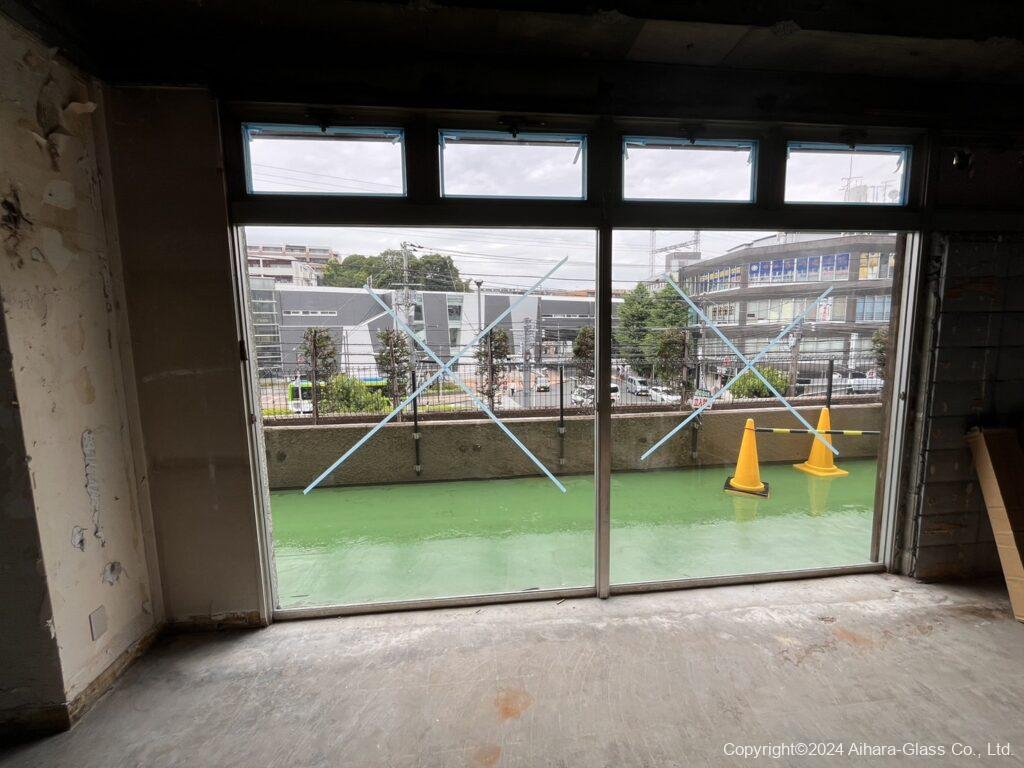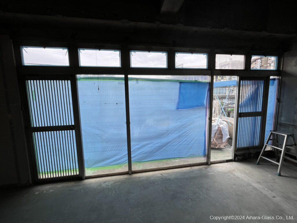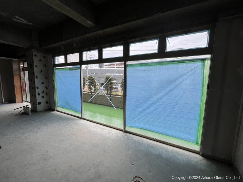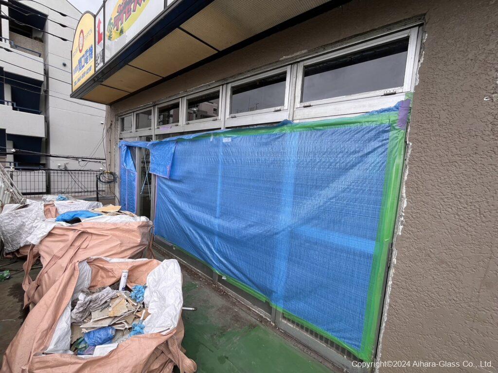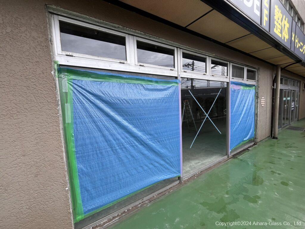 ガラスの交換前は、割れている部分もあり中も見えていたのでブルーシートで中が見えない様にシャットアウトされていたのですが、交換したタイミングでブルーシートは撤去いたしました。