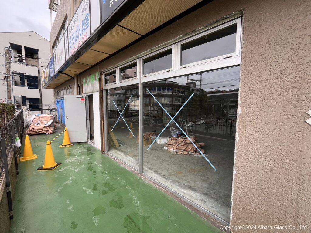 元々はカラオケボックスだったこの店舗、室内から外が見えない様にガラス際に壁を作り個室を作っていたのですが、退去の際にガラスの割れなどがあり該当部分のガラス交換となりました。