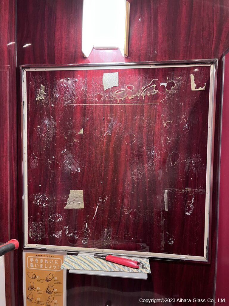 鏡は割れていた訳ではなく、鏡の裏の塗布された銀幕が腐食してしまい見た目が美しくないとの事で交換となりました。