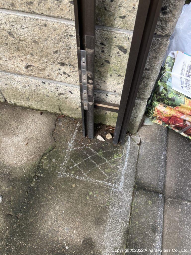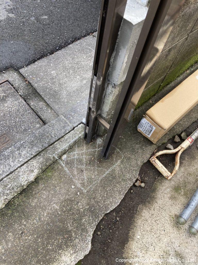 まず、新しく埋める柱の穴を掘る為に250×250×深さ350の穴を掘る為に、凡その位置をマーカーで書きコンクリートを掘削します。