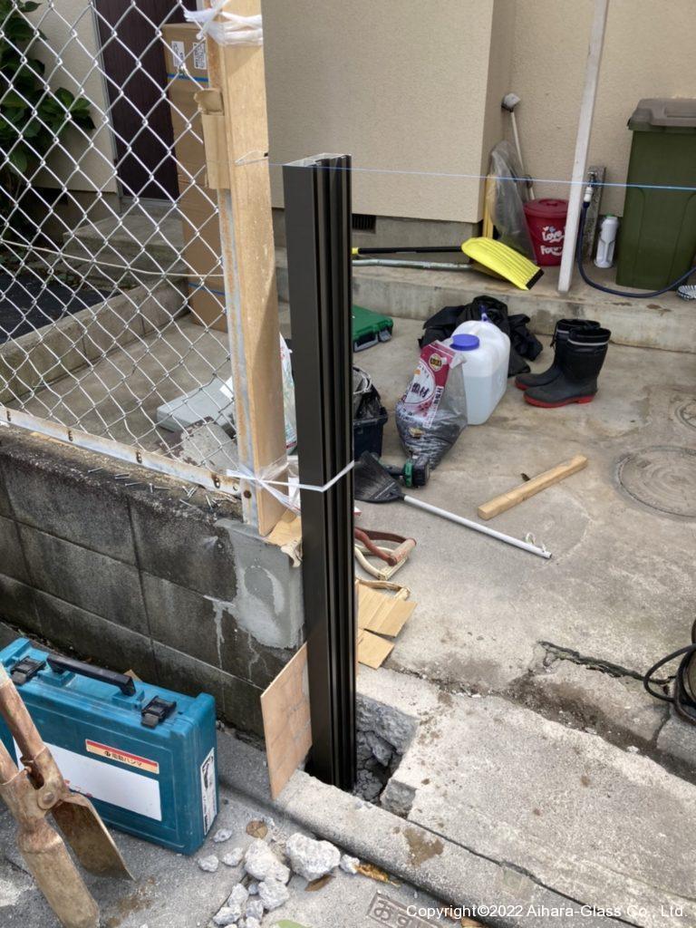 穴が掘れたら支柱を埋めるのですが、本体にメーカーからの指示で「ここの線まで埋めてください」とありますので、その線がしっかりと入るまで埋めます。また、左右の柱の高さが合っていないと見た目も良くないので、糸を張って高さを合わせて水平垂直を出した時点で生コンを流し込み支柱を固定します。